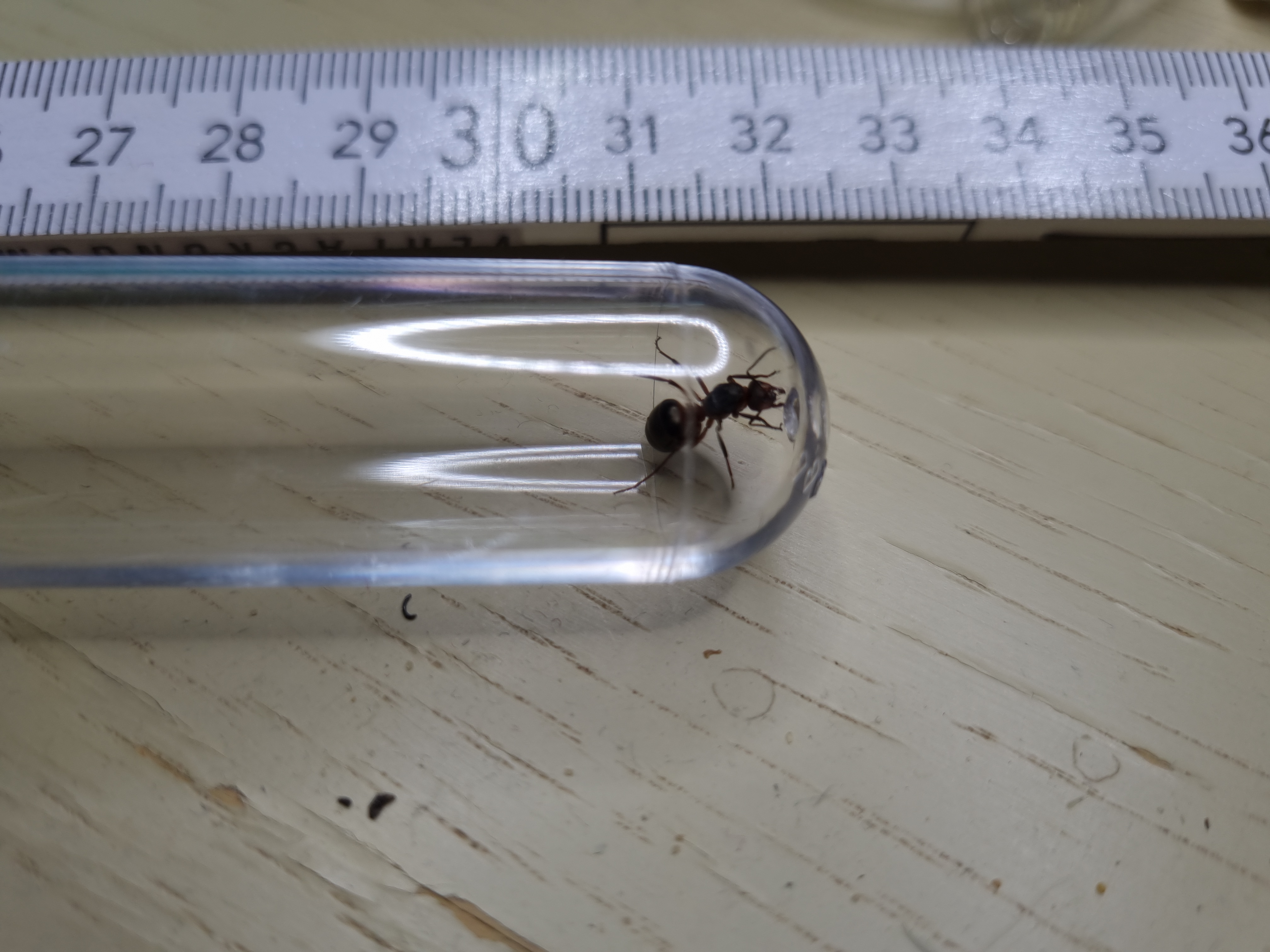 Eine dieser größeren Ameisen + 4 Arbeiter habe ich gestern bereits in ein größeres Becken gesetzt, zusammen mit einem Reagenzglas mit Wasser, in der Hoffnung, dass sie dort einzieht.