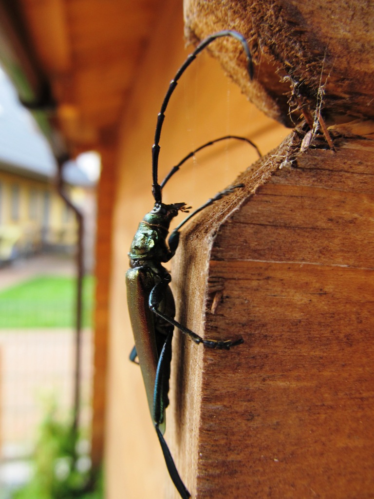 vergleiche mal mit Bildern vom Moschusbock (Aromia moschata). Wenn es sich, um diese Art handelt, könnten sich in der nähe Bestände von Weiden, Pappeln oder Erlen befinden, da sich dieLarven xylobiont, d.h. vom Holz und dort bevorzugt von Weichholz ernähren.
