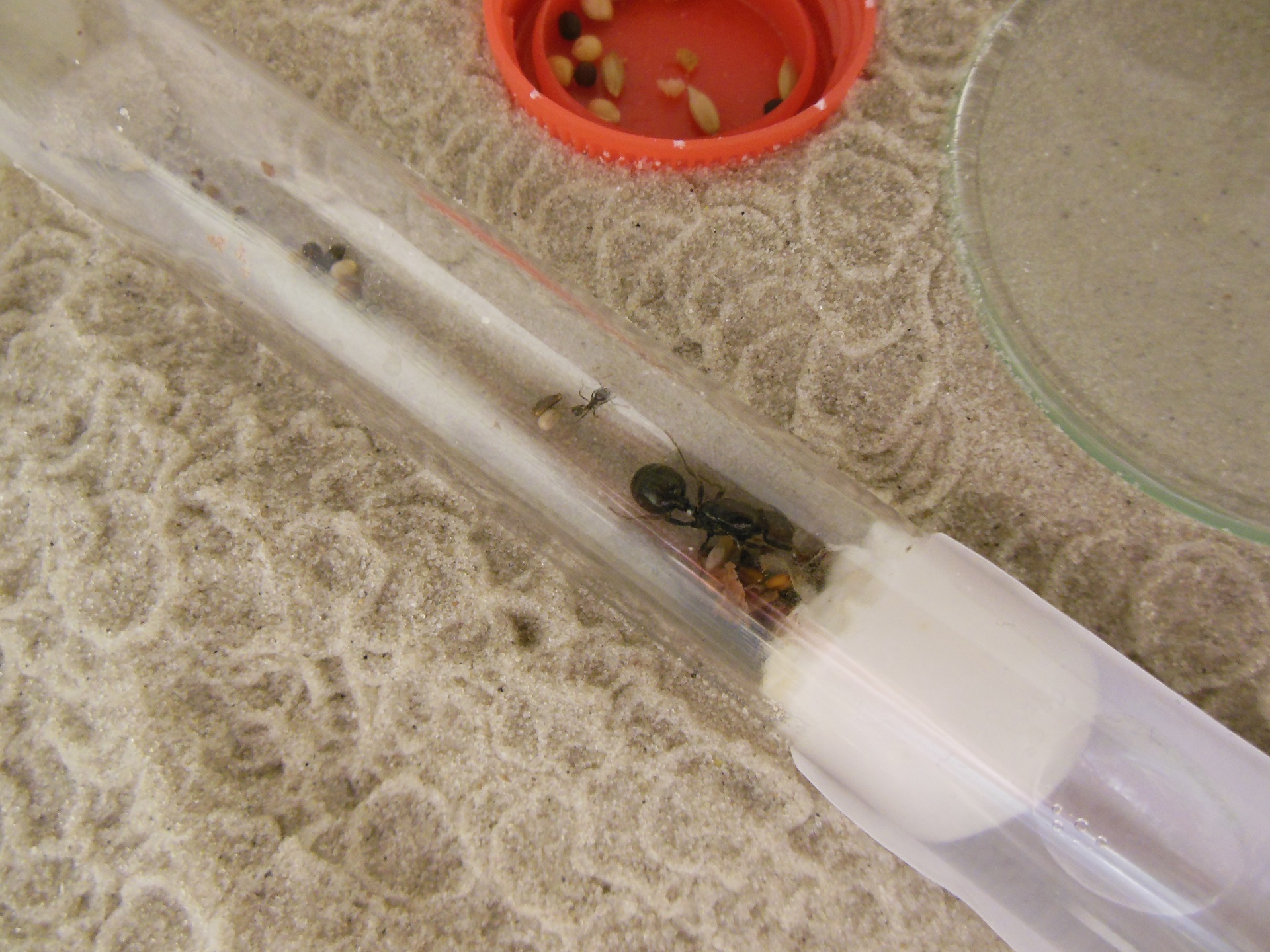 Die Arbeiterin war anfangs sehr neugierig und hat alles erkundet. Bisher konnte ich keine Futteraufnahme sehen, aber Körner waren schon von Anfang an im RG.