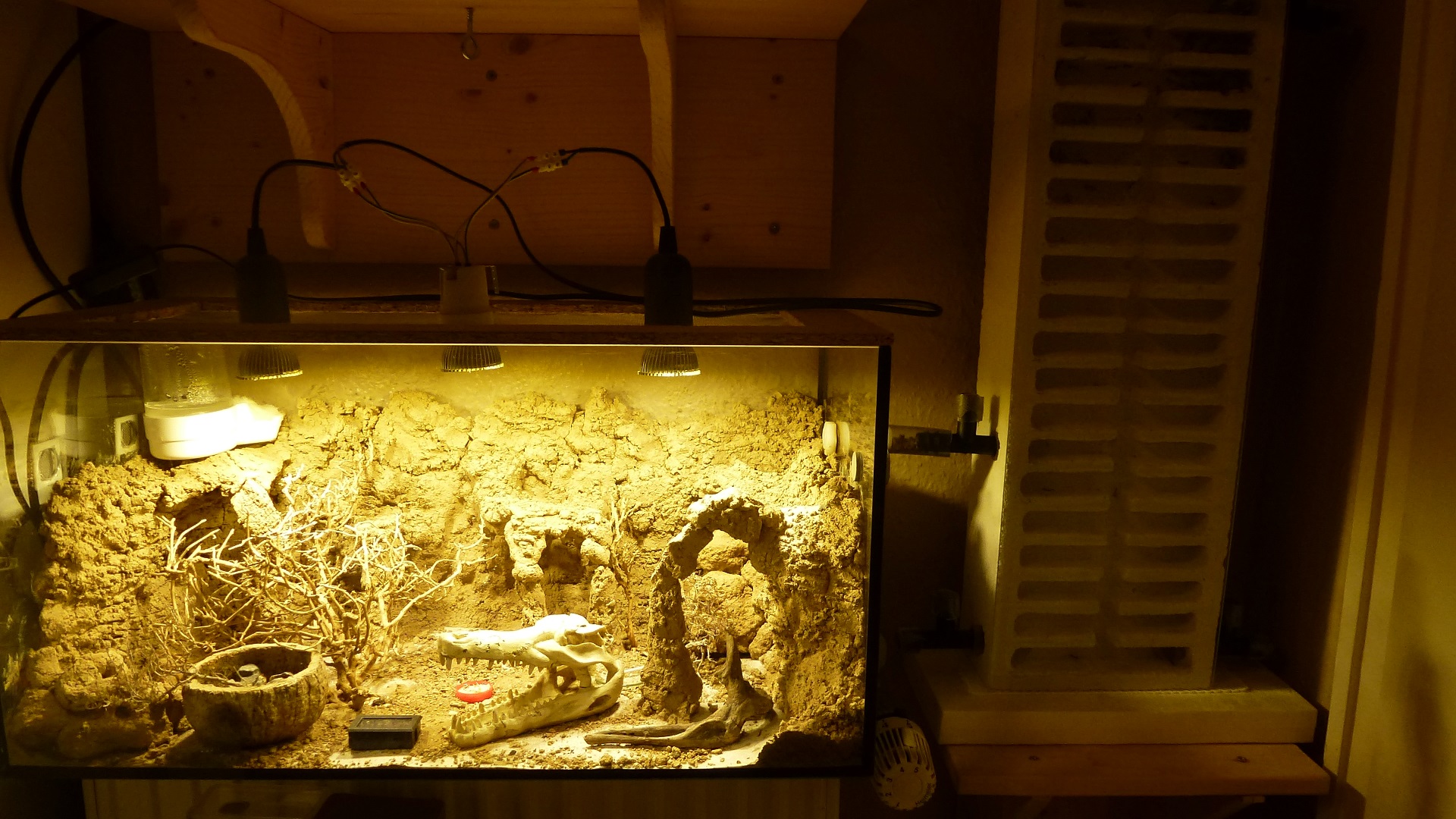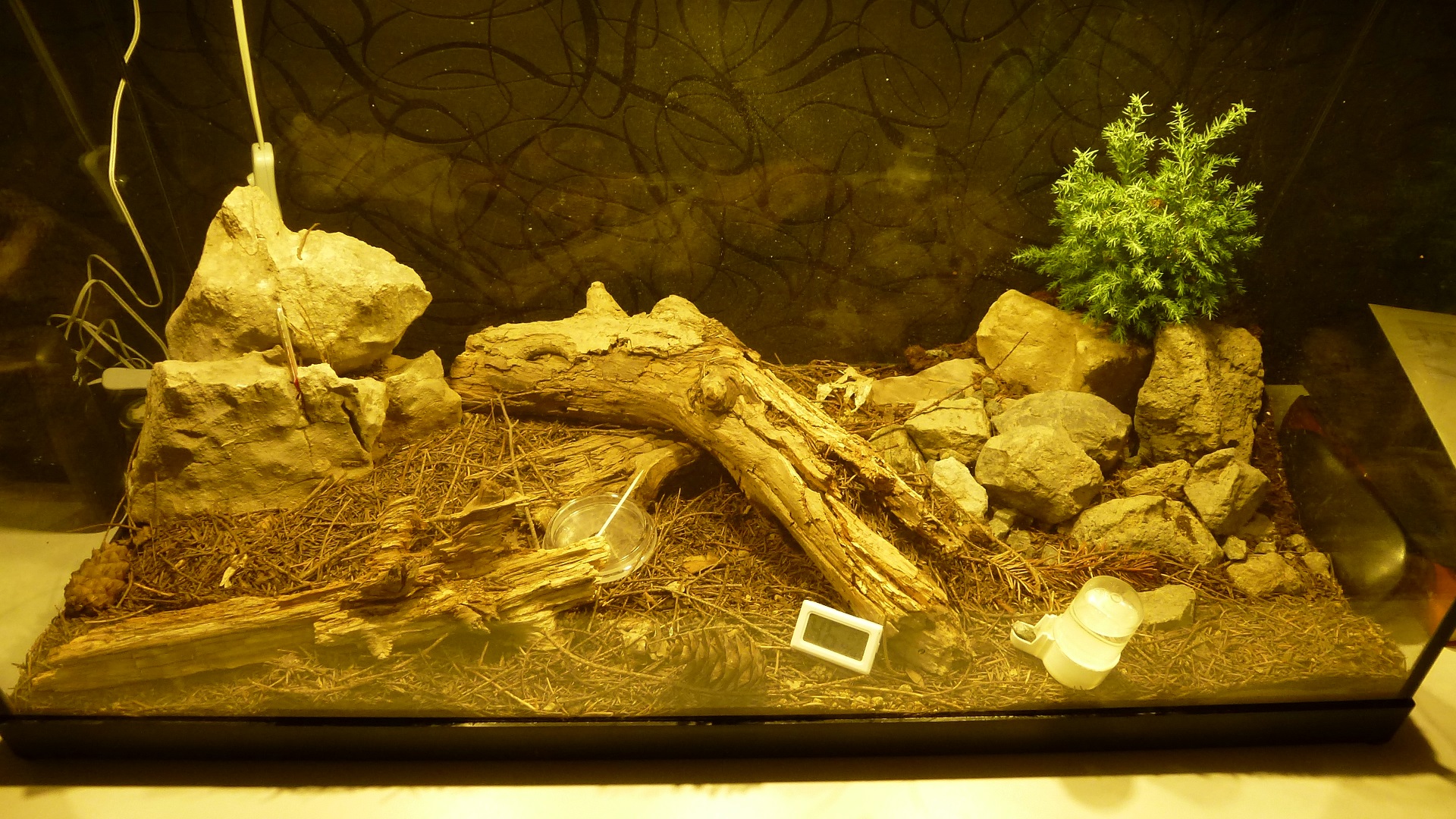 Die Ameisen wohnen in dem Ast in der Mitte, der einige Löcher hat, in die die Ameisen gerne eingezogen sind. Das Formicarium ist 80x45x50 cm groß.
