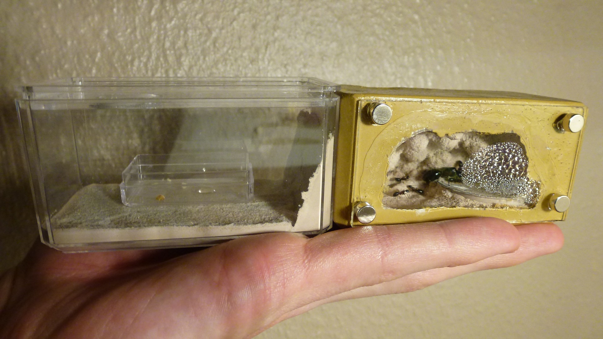 Die Gründungsarena hat 2 Anschlüsse nach außen und ist ideal um meine 30mm Reagenzgläser anzuschließen. Bisher ist es mit meinen Messor barbarus besetzt.