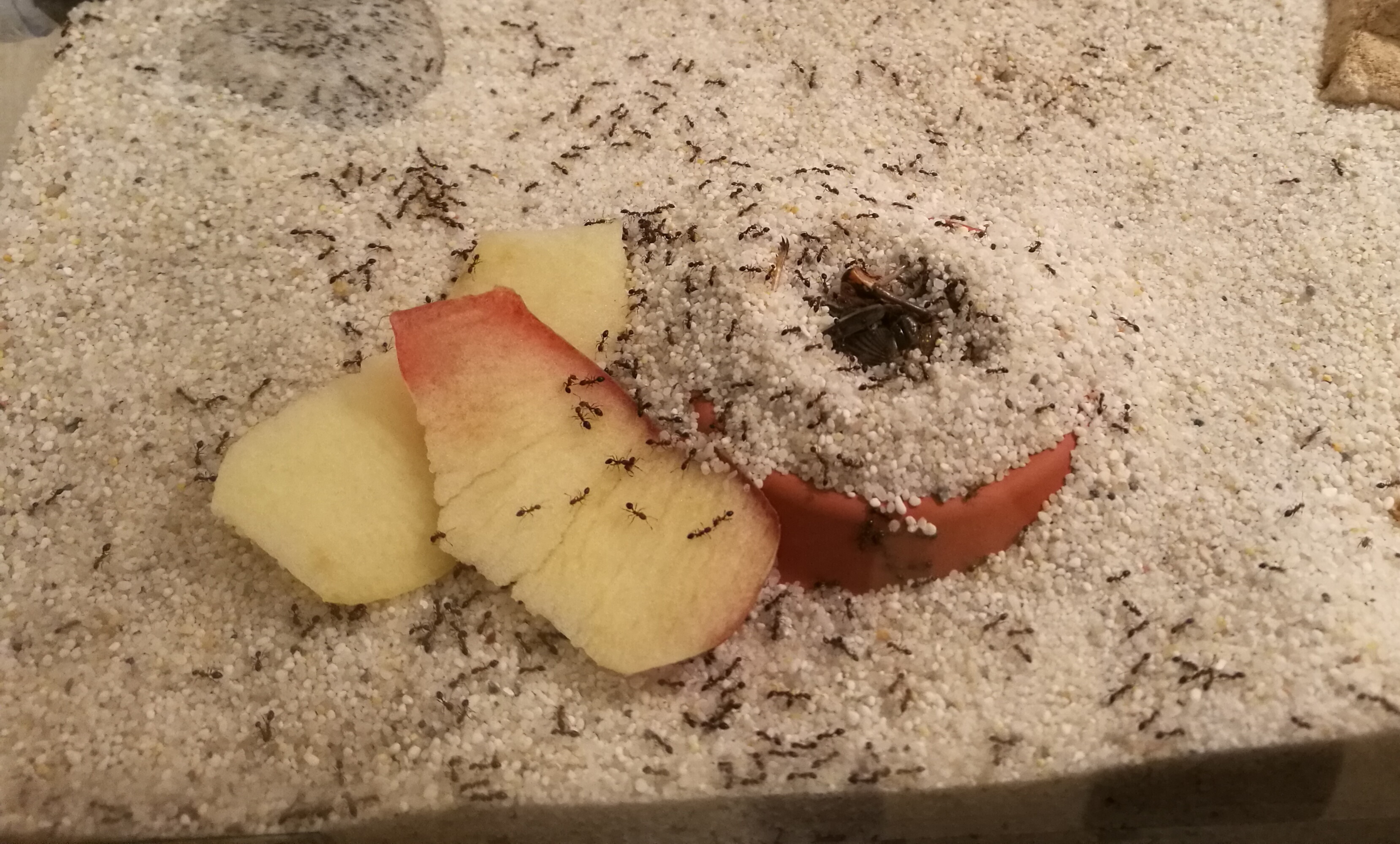 Vor etwa 3 Stunden gab ich ihnen Apfelschalen und nun sind etwa 70% der Kolonie draußen, ein riesen Verkehr im Schlauch und eine totale Hysterie im Nest.