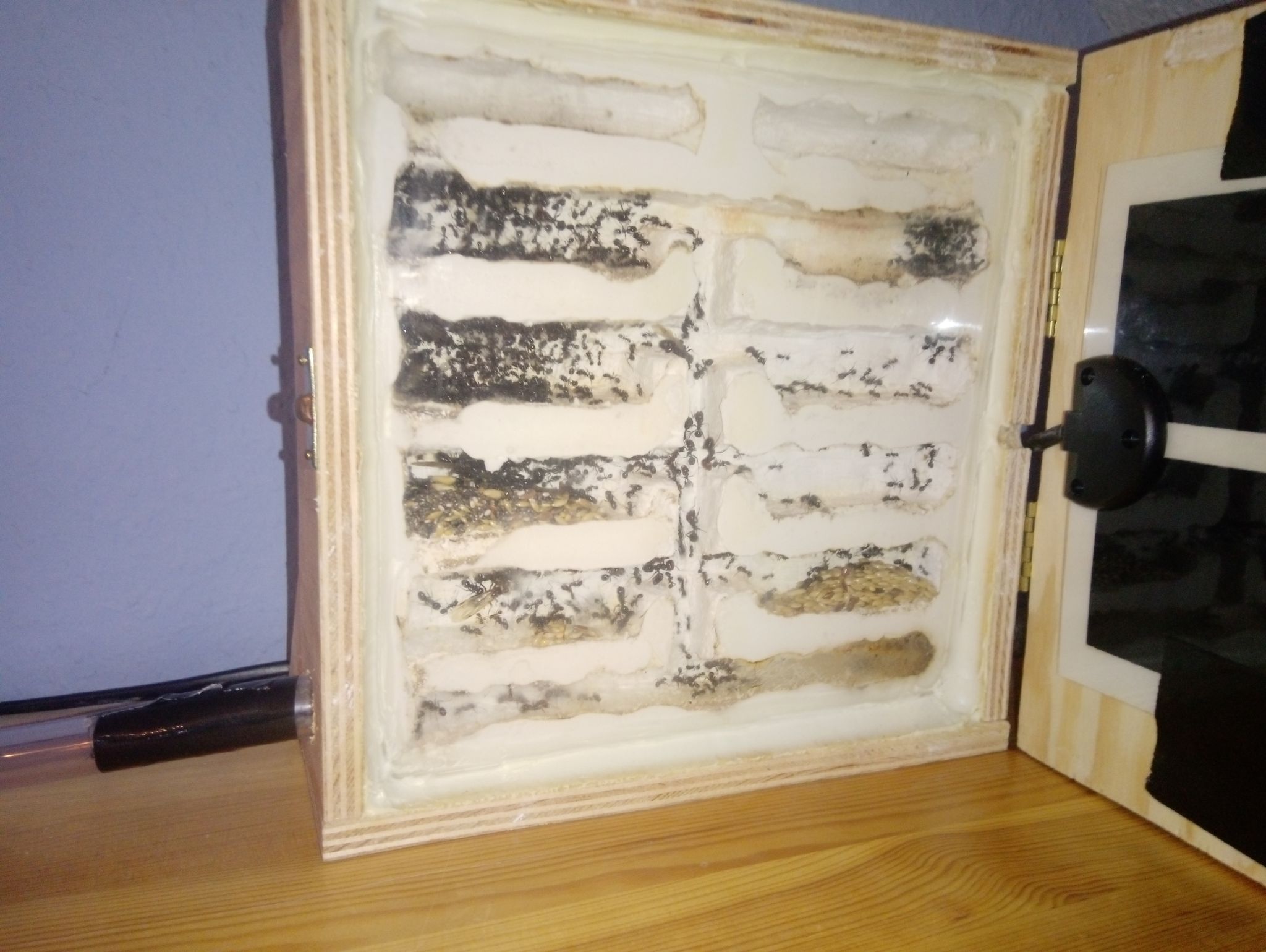 Danke fürs Lob, beim alten hab ich immer von oben in die obersten 2 Kammern, mithilfe einer Spritze und Kanüle befeuchtet. Am Anfang einmal die Woche, aber durch die zu geringe Belüftung, hatte sich dort sehr schnell der erste Schimmel gezeigt. Den hatte ich dann durch weniger Befeuchten und immer wieder einführen von Springschwänzen in den Griff bekommen. Mittlerweile beobachte ich die Ameisen, sind sie viel an der Wasserstelle, wird befeuchtet und das scheint ganz gut zu klappen bisher. Dadurch wurden die obersten Kammern für die Brut benutzt und die unteren als Körnerkammern. Im neuen Nest werde ich nach Bedarf dann entweder eine Befeuchtungskammer befeuchten oder beide, je nachdem wie gerade Brut vorhanden ist.