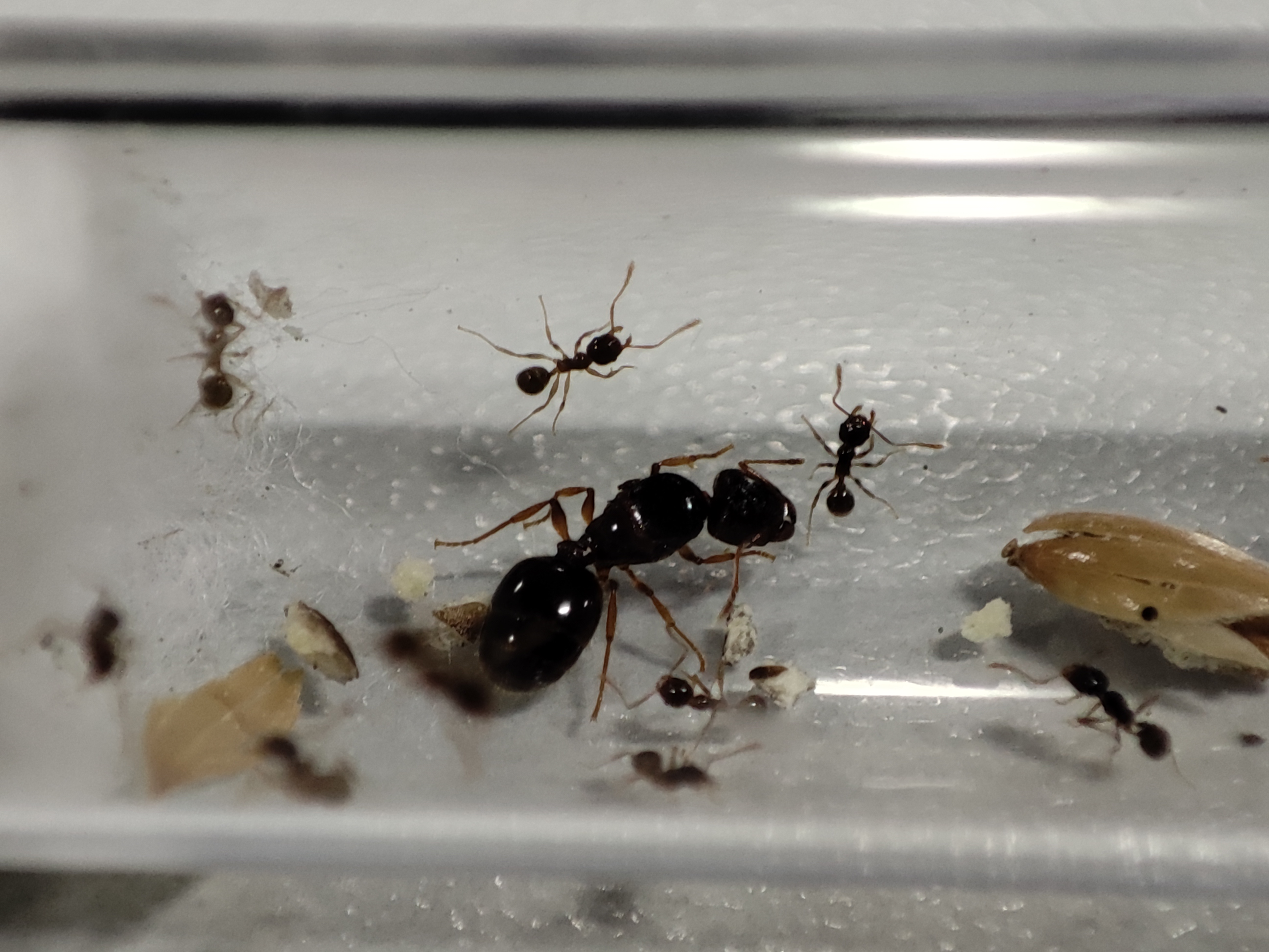Die Kolonie ist am 13.12.2021 nach einer 3 Tägigen Reise aus Spanien (anthouse.es) per DHL Express angekommen. Die Kolonie macht für mich einen Fitten Eindruck. Passend zur Winterruhe werden sie jetzt nach dem Transport an das dazu bestellte Anthouse angeschlossen, so dass ich einen Tropfen Honigwasser und eine Made als Futter bereitstellen kann. Da das RG am neuen Nest angeschlossen wird, und sich die pallidulas erstmal auf erkundungstour begeben müssen, kann es noch etwas dauern, bis die erste Arbeiterin das Futter entdeckt.