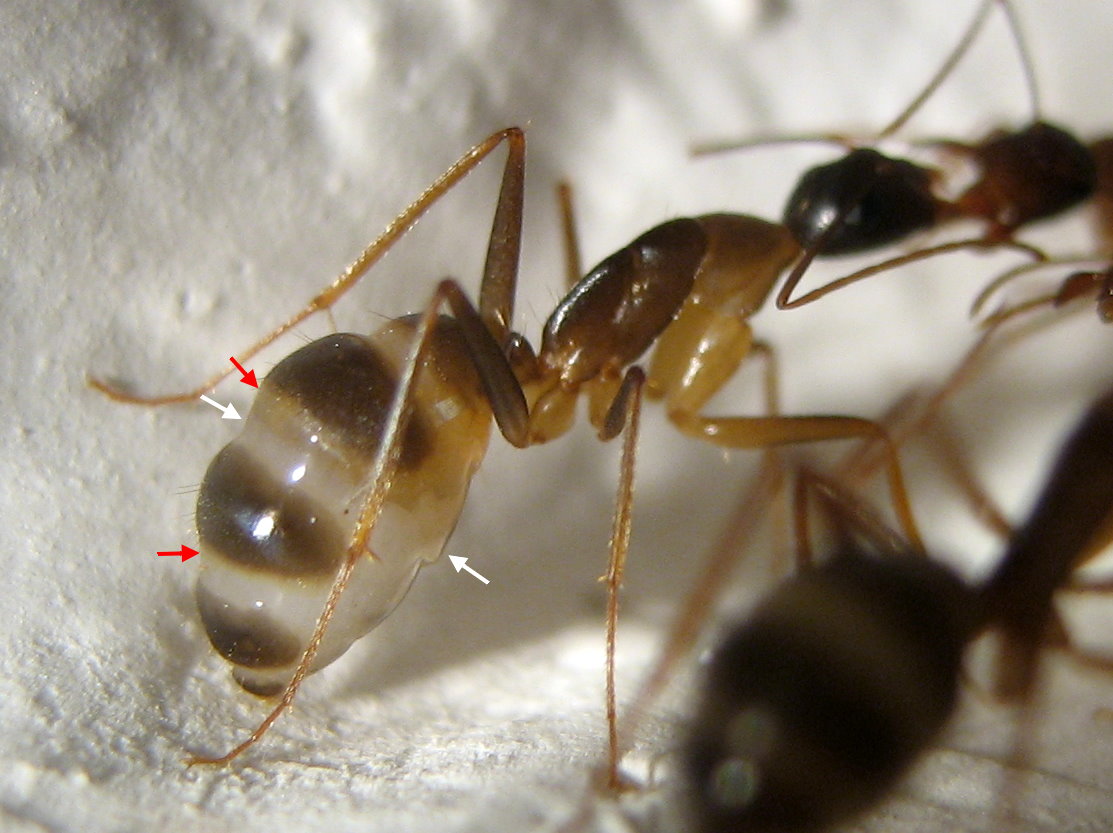 Gaster rot. Erst sieht man, das viele Ameisen viel Flüssigkeit i