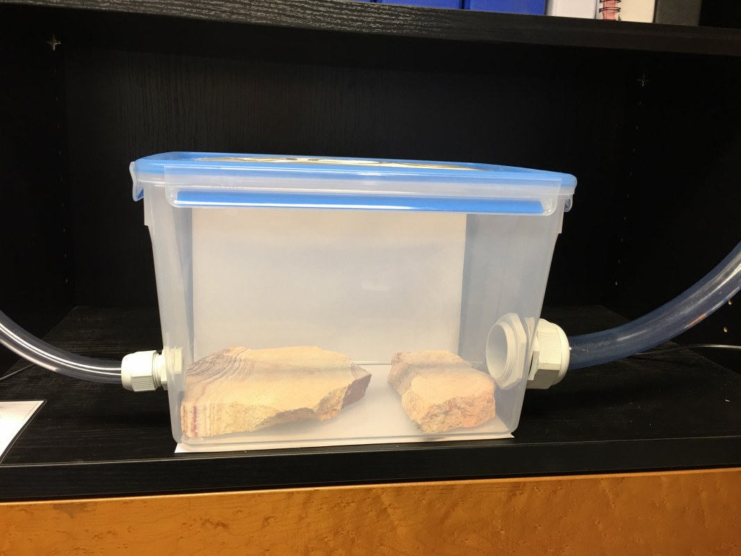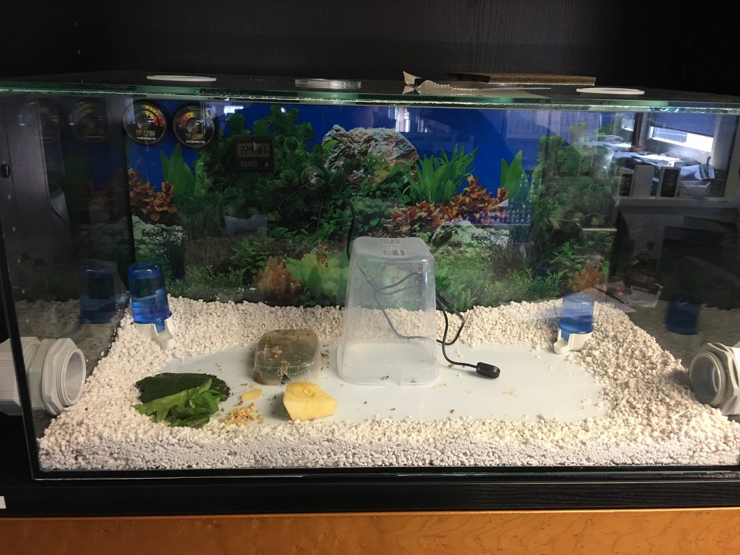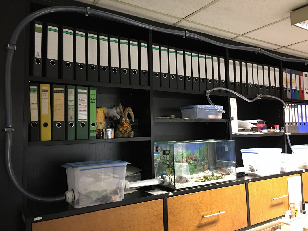 Die Grundanlage (beliebig erweiterbar) besteht aus einem Aquarium 60x30x30 cm aus dem Baumarkt, 3 Stück Frischhaltedose 32,7 x 22,7 x 21,5 cm, einer kleinen Frischhaltedose 32,7 x 22,7 x 11,1 cm, Ø 38 mm Acrylrohr, Ø 30 Kunststoffschlauch, Schraub-PGs zum sicheren Verbinden der Becken. Auf Deko wurde bewusst verzichtet.