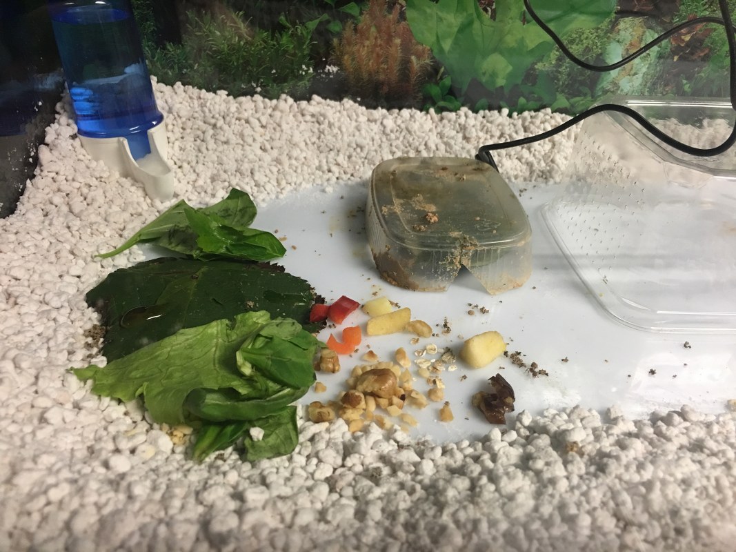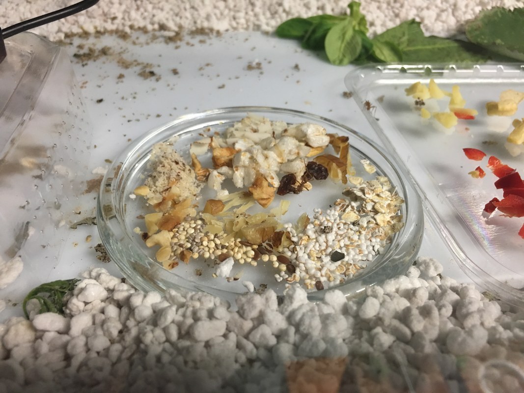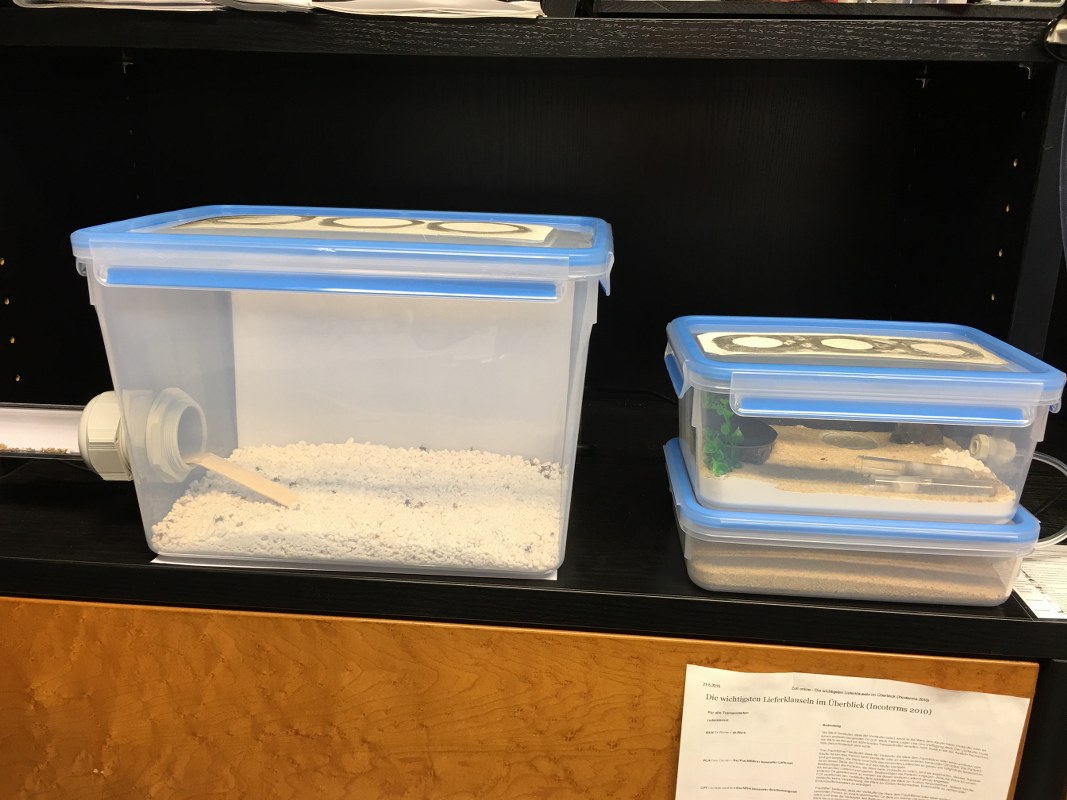 ) Auswahl an Futter platziert.Als Ausbruchschutz dient, neben den absolut dicht abschließenden Deckeln, Paraffinöl - langfristig kann man diesen Schutz aber wohl vergessen.