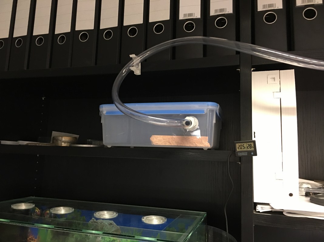 Schneidtätigkeiten fanden nur sehr zaghaft statt, dafür wurde die Tränke sehr stark frequentiert. Temperatur habe ich bei 23-25 Grad eingependelt, LF im großen Becken am Boden bei 75 bis 78%.