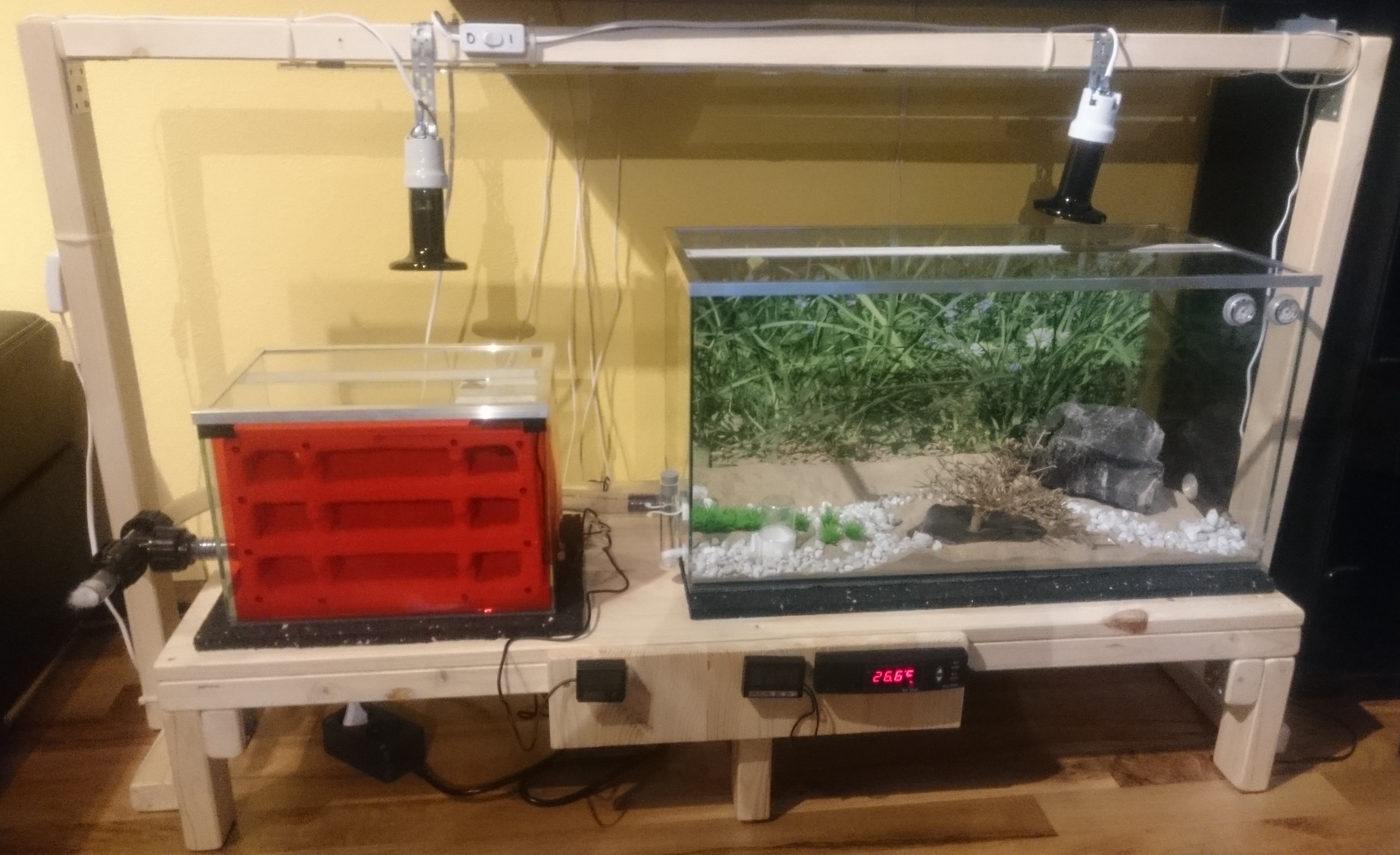 Der Arenaboden besteht aus einer 1-2cm dicken Sandschicht. Mit weißen Marmorsteinchen sind ein paar Wege dargestellt. Außerdem ist der Trinkbereich mit den Steinchen bestückt. Hier sind aktuell noch 2 verschiedene Tränken zu sehen. Ich möchte testen welche der beiden Tränken besser ankommt. Neben dem Trinkbereich gibt es noch 2 Futterbereiche. Der 1. Futterbereich liegt auf dem schwarzen Stein. Auf diesem Stein sollen zukünftig Insekten angeboten werden. Der 2. Futterbereich ist für die Körner und befindet sich in der vorderen Rechten Ecke. Der Keramikstrahler über der Arena wird über eine Zeitschaltuhr gesteuert und dient nur dazu kalte Wintertage in der Arena angenehmer zu machen. Die LED Leiste über den Becken ist so angeschlossen, dass sich die LEDs über dem Nest abschalten lassen, um die Lichteinwirkung zu minimieren. Die kleinen Pflanzen sind Aquarienpflanzen aus Plastik.